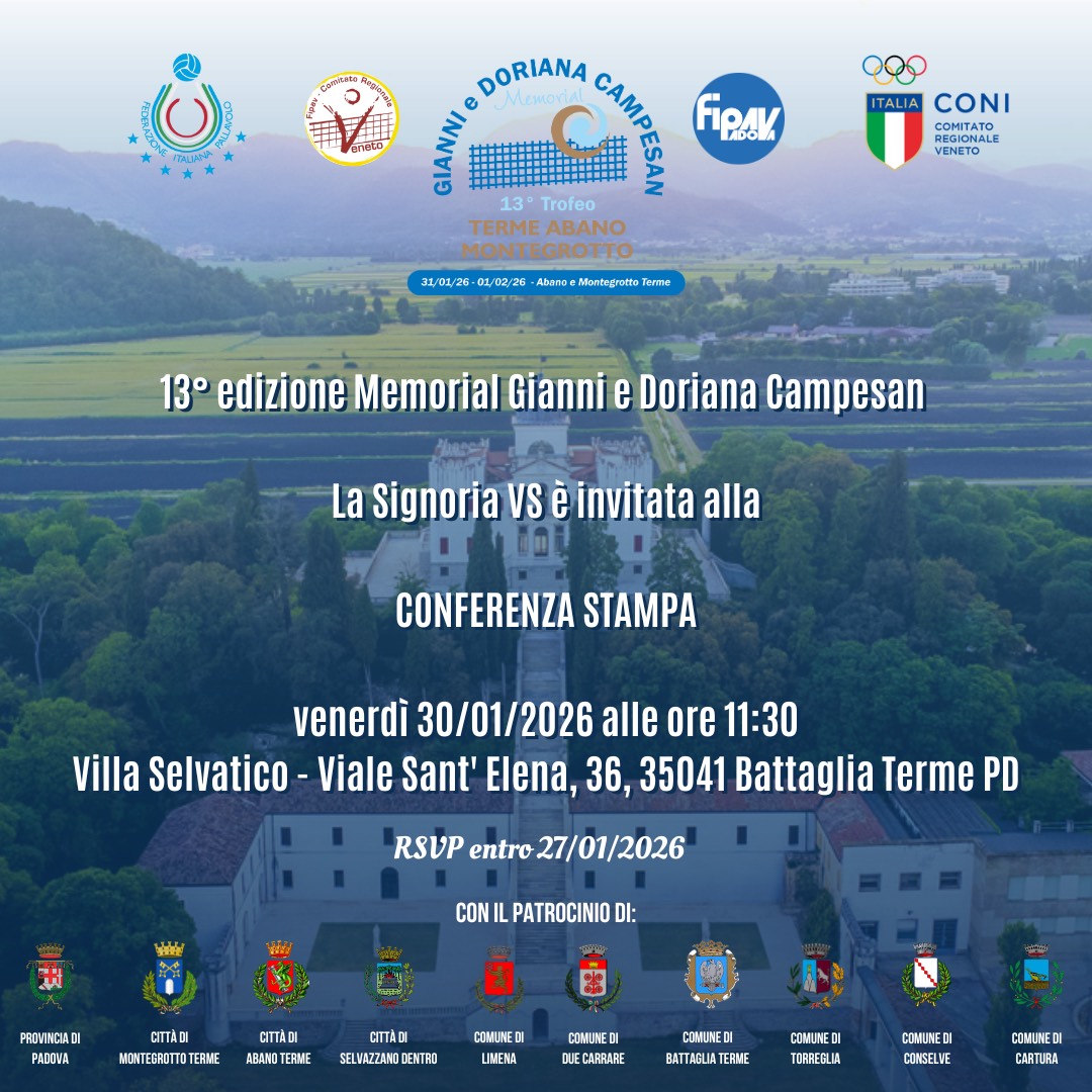 Si terrà Venerdì 30 gennaio 2026 alle ore 11.30 presso Villa Selvatico, in Battaglia Terme, presieduta dal Presidente Federale, Giuseppe Manfredi, e dal Presidente Territoriale di Padova, Cinzia Businaro, la conferenza stampa della 13a edizione del Trofeo Terme Abano Montegrotto - Memorial Gianni e Doriana Campesan.